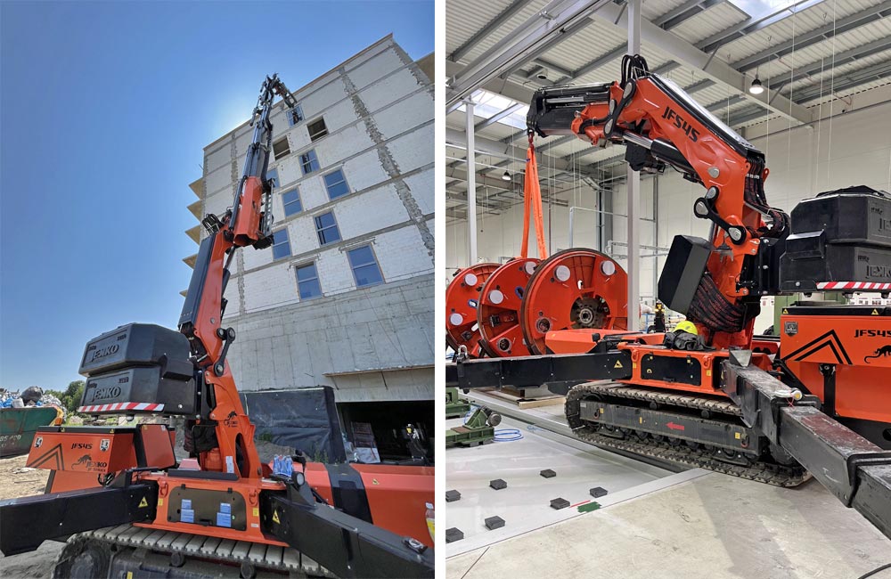JEKKO JF 545 to przegubowy mini żuraw gąsienicowy klasy „heavy duty”, łączący cechy żurawia przeładunkowego i mini dźwigu. Idealny do pracy w zakładach przemysłowych, przy montażu ciężkich instalacji technologicznych, konstrukcji stalowych oraz dużych przeszkleń na wysokości. Dzięki wysięgowi 32 m może pracować nad przeszkodami, instalacjami dachowymi i w trudno dostępnych częściach obiektu. Szerokość 1,9 m i podwozie gąsienicowe zapewniają dobrą stabilność i mobilność na wymagającym terenie.